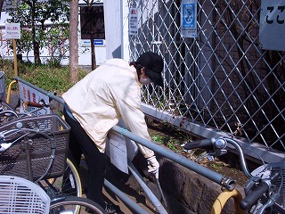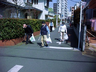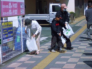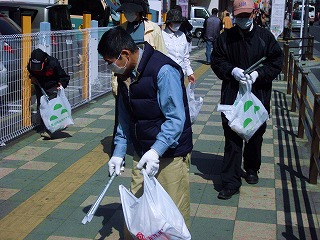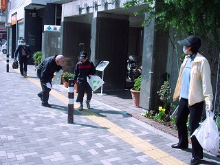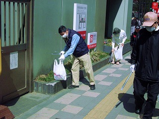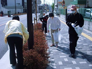 調布教会周辺から調布駅界わいにかけて、大きな道路沿いに歩いて清掃活動を行いました。この日は、春を通り越して暑いほどでしたが、皆、花粉や黄砂を避けるため、マスクをしながらの清掃に精を出しました。写真でようすをご覧ください。