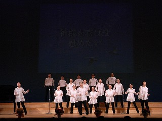 讃美礼拝では、その名の通り、西東京教区の青年から構成される West Youth Couir(ウエスト・ユース・クワイア)が終始登壇、成約聖歌やオリジナル曲など計10曲以上にわたってコーラスを続けました。中でも、ソプラノ歌手松尾さんのソプラノ独唱があり、神の愛を清らかで高潔に歌い上げるその歌声に、大きな感動が引き起こされました。