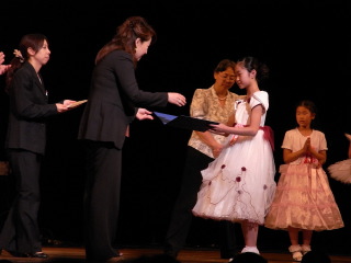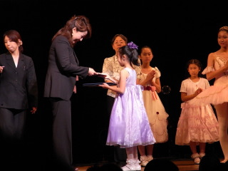 同コンサートでのメイン、芸術奨学金授与者5名が登壇、絵画作品の披露、ピアノ演奏、クラシックバレエなどが披露されました。その後、仁進(インジン)様がご登壇、宋総会長とともに、授与者への芸術奨学金証書の授与が行なわれました。